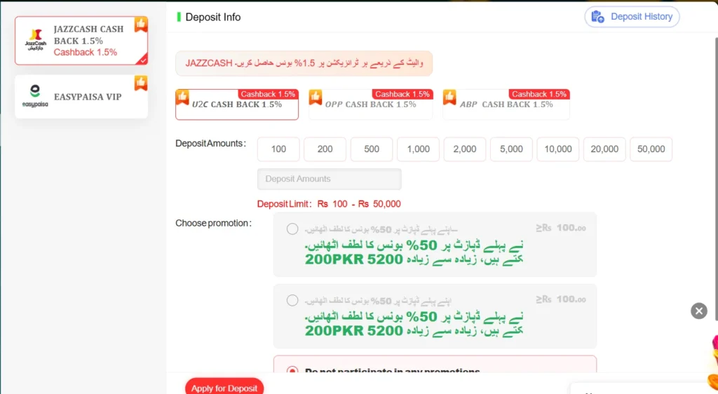 Deposits and withdrawals are supported via JazzCash, Easypaisa, and other popular methods.